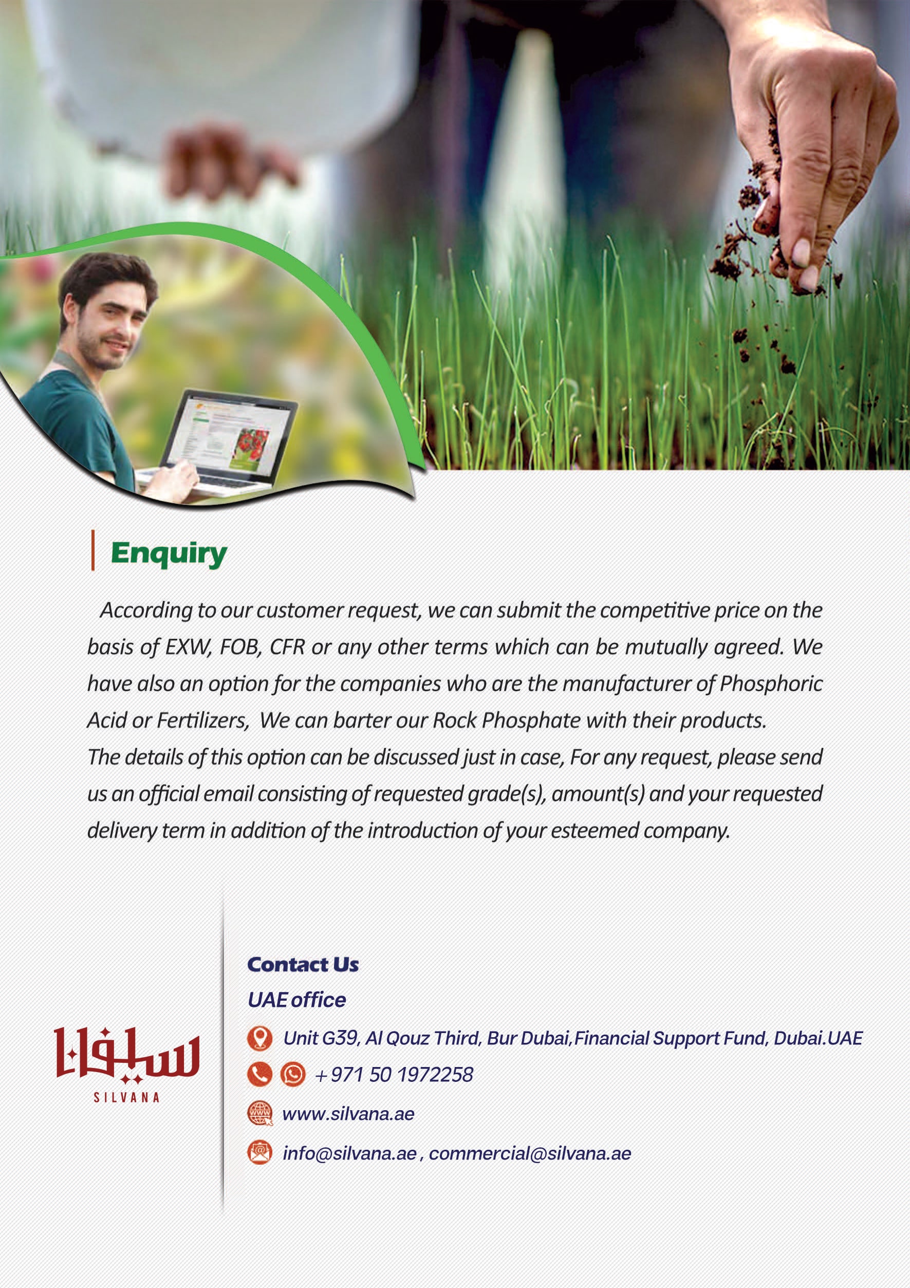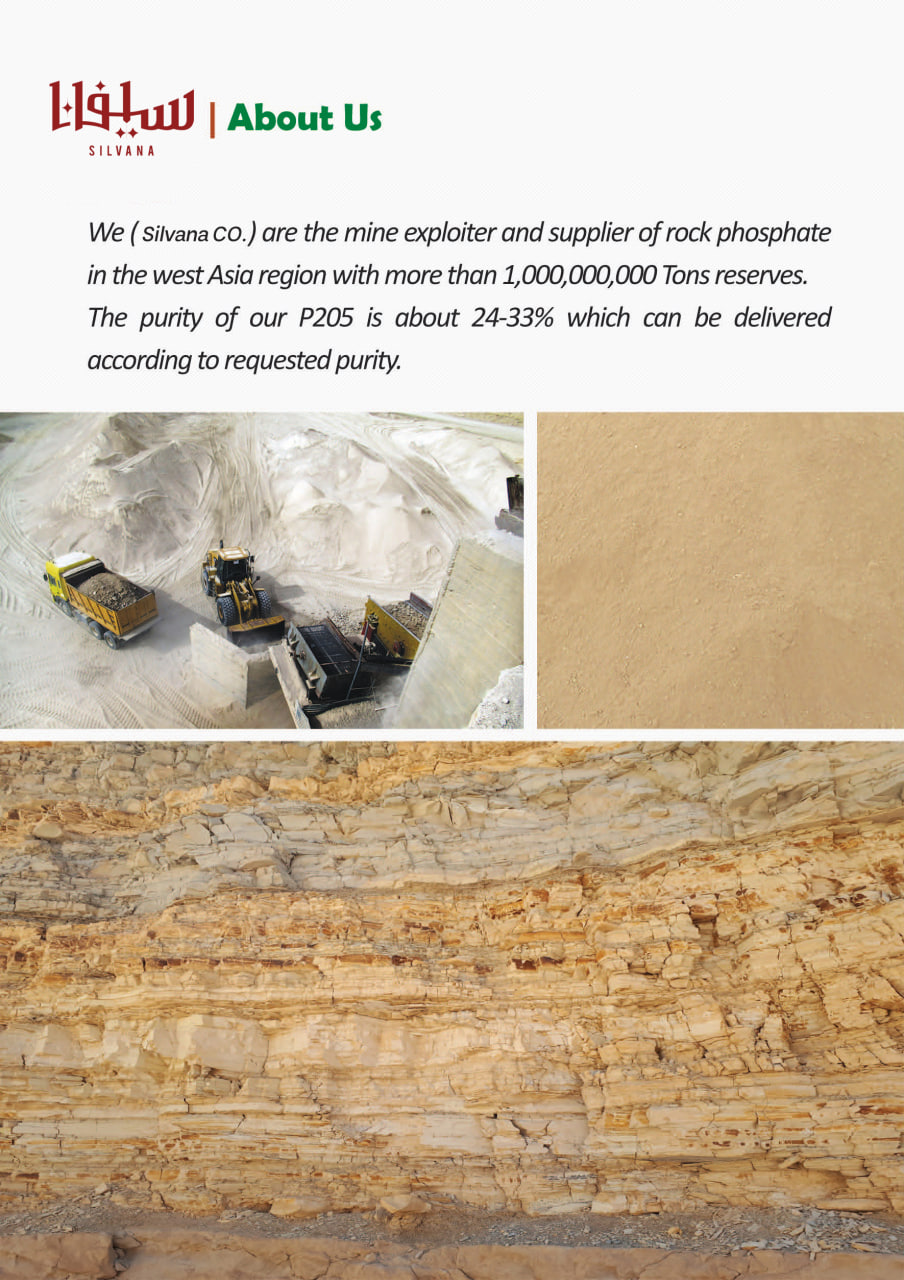 Mine exploiter and supplier of rock phosphate We ( Silvana co.) are the mine exploiter andsupplier of rock phosphate in the west Asia region with more than 1,000,000,000 Tons reserves.The purity of our P205 is about 24-33% which can be delivered according to requested purity.